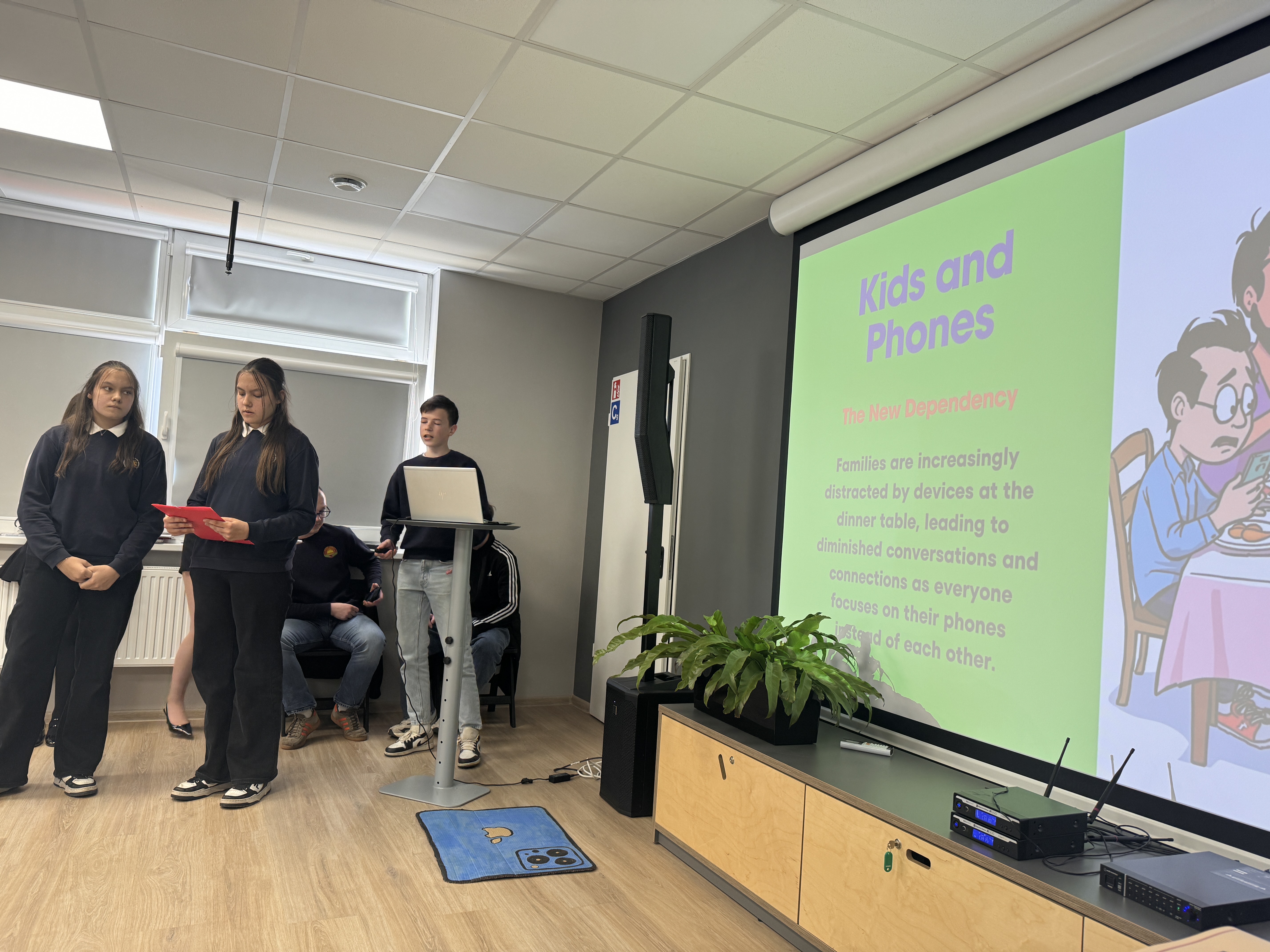 Mūsų gimnazijai atstovavo 6, 7 ir II g klasių mokinių komandos. Visos komandos pasirinko temą apie telefonų naudojimą: šeštokai parodė, kaip svarbu kartais palikti technologijas ir mokytis galvoti, mąstyti patiems, septintokai – kaip jiems sekėsi iššūkyje – savaitė be telefono; o dešimtokai kvietė giliau pamąstyti, kodėl mes, sujungti technologijomis, vistiek jaučiamės vieniši.