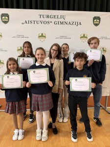 Konkurse dalyvavo būrys mūsų ginnazistų: lietuvių kalbos diktantą rašė 5 kl. mokinė Mia-Elizabeth Sirica, 7 kl. mokinė Viktorija Dobrinskytė, IG kl. mokinė Margarita Salavei, o anglų kalbos diktante savo jėgas pirmą kartą išdrįso išbandyti 6 kl. mokinys Ernestas Butrimas ir jau paskutinį kartą galintis sudalyvauti IIG kl. mokinys Justas Misiukevičius. Mokiniai gavo padėkos raštus už dalyvavimą konkurse.
