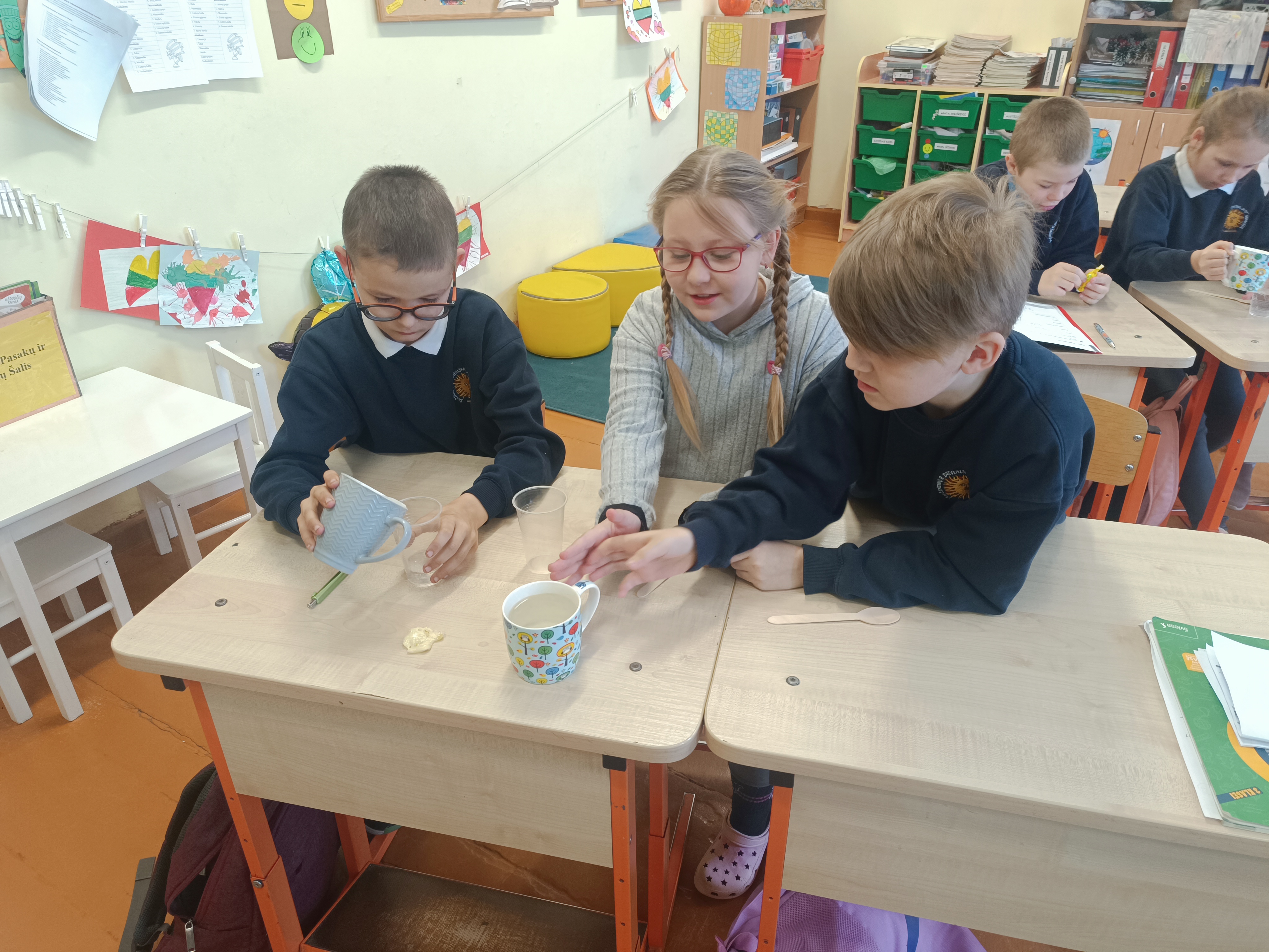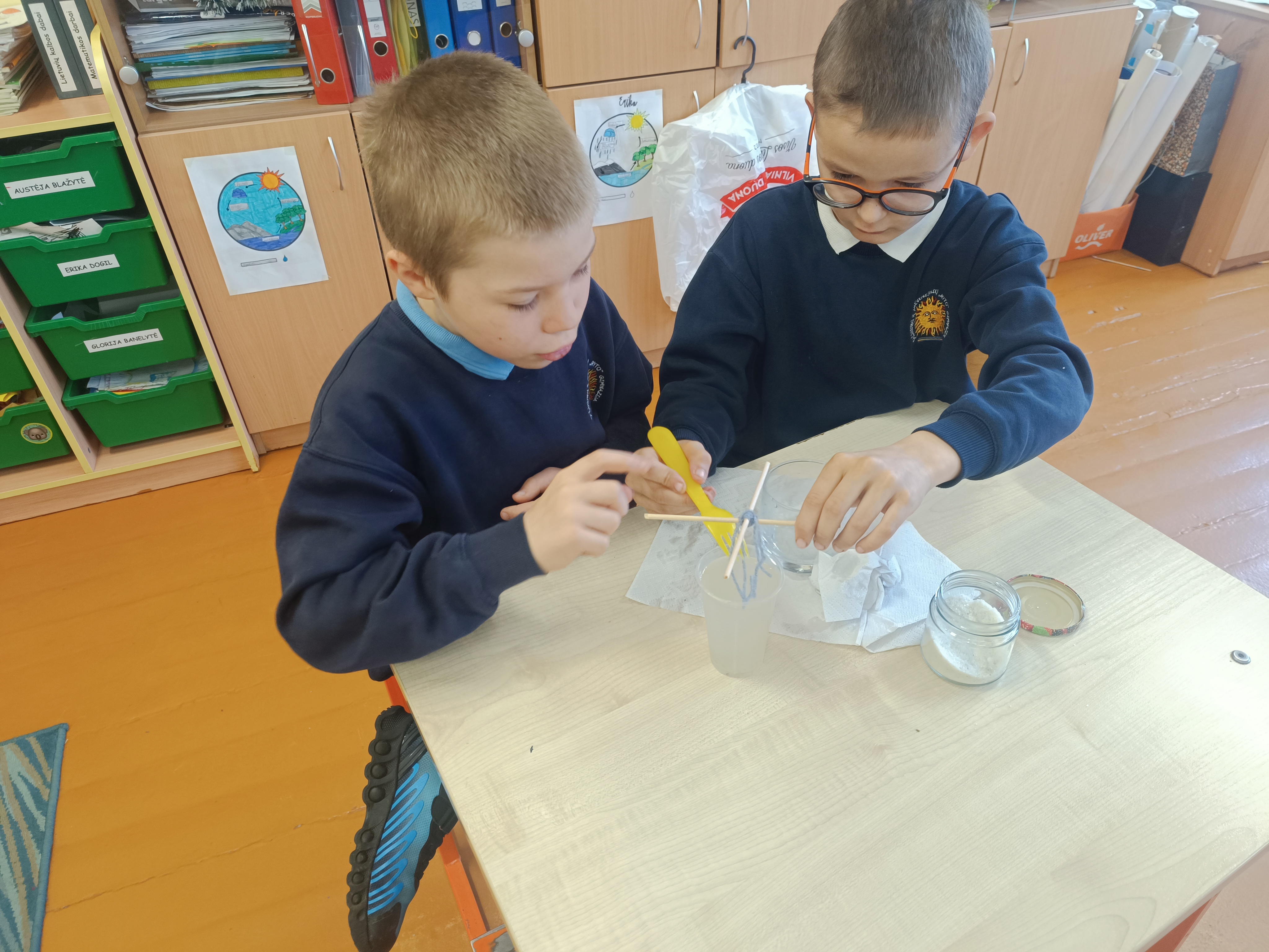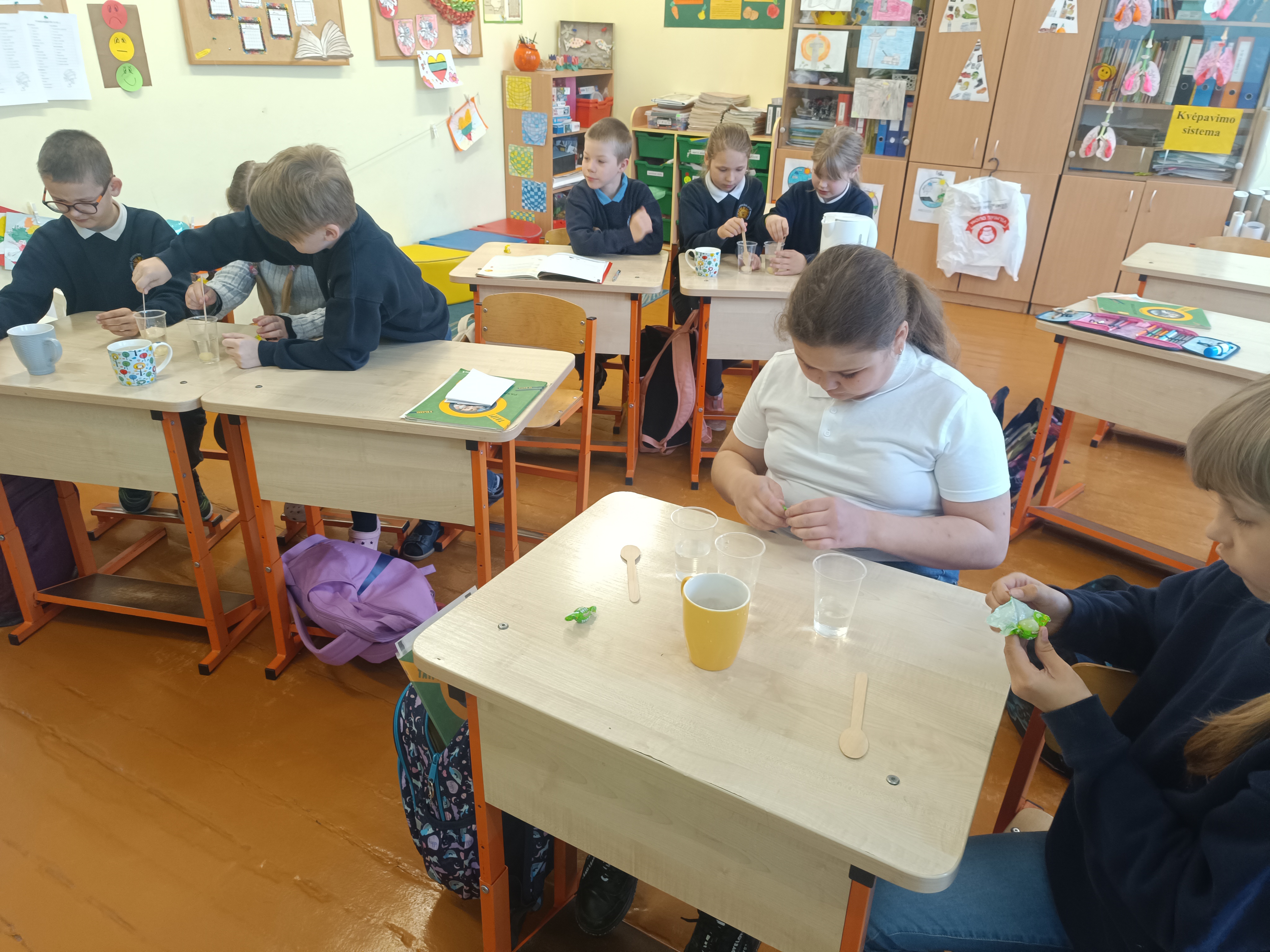 Gamtos mokslų pamokos metu trečiokai tapo tyrinėtojais. Pasiskirstę į tris grupes, mokiniai eksperimentavo: stebėjo, kaip medžiagų tirpimą veikia maišymas, vandens temperatūra bei dalelių dydis. Be šių tyrimų, vaikai mokėsi kantriai užsiauginti druskos kristalą. Eksperimentuodami mokiniai ugdėsi pažinimo kompetenciją, nes patys ieškojo atsakymų į mokslinius klausimus. Dirbdami komandose jie stiprino socialinius įgūdžius bei komunikavimo kompetenciją – mokėsi susitarti, dalintis darbais ir aiškiai pristatyti gautas išvadas. Tokios praktinės veiklos leidžia gamtos reiškinius pažinti įdomiai ir efektyviai.