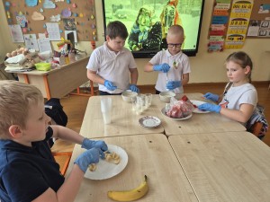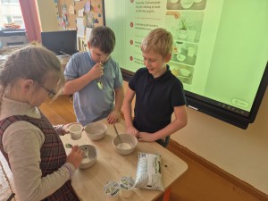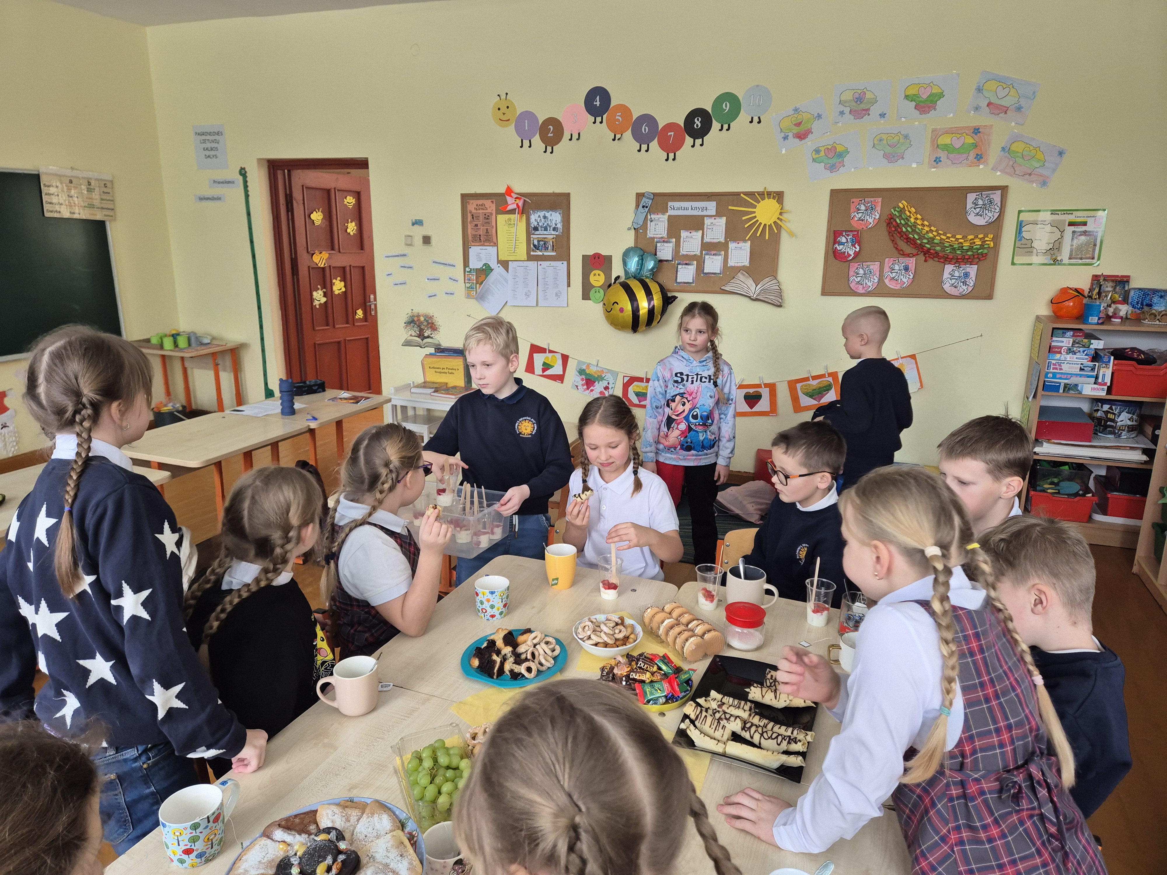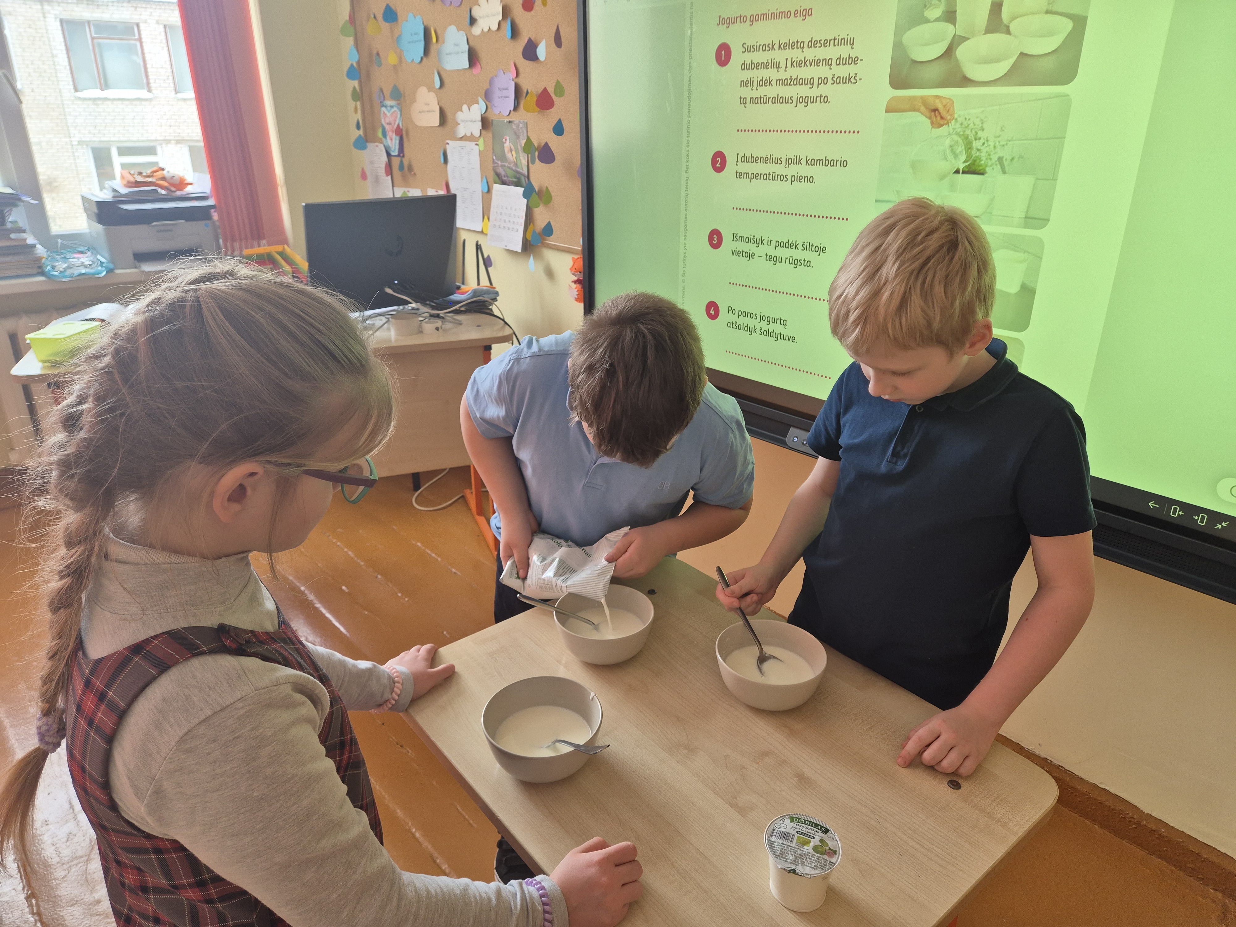 2 klasėje vyko integruotos lietuvių kalbos ir pasaulio pažinimo pamokos. Per lietuvių kalbos pamoką vaikai skaitė skelbimą apie „Sveiko maisto šventę“ ir labai susidomėję veikla nusprendė klasėje pasigaminti sveikuoliškų patiekalų. Mokiniai ne tik gilino žinias apie sveiką ir visavertę mitybą, bet ir patys gamino sveikuoliškas salotas iš mėgstamų vaisių, pagardindami jas jogurtu. Salotų gaminimo procesas jiems buvo labai smagus ir įtraukiantis: patys plovė ir pjaustė vaisius, prisiminė ir pakartojo kiekvieno vaisiaus pavadinimą, mokėsi kultūringo elgesio prie stalo. Veikla skatino savarankiškumą, atsakingumą, tarpusavio bendradarbiavimą. Vaikai noriai skanavo savo pagamintas salotas, sužinojo vaisių naudą jų sveikatai.