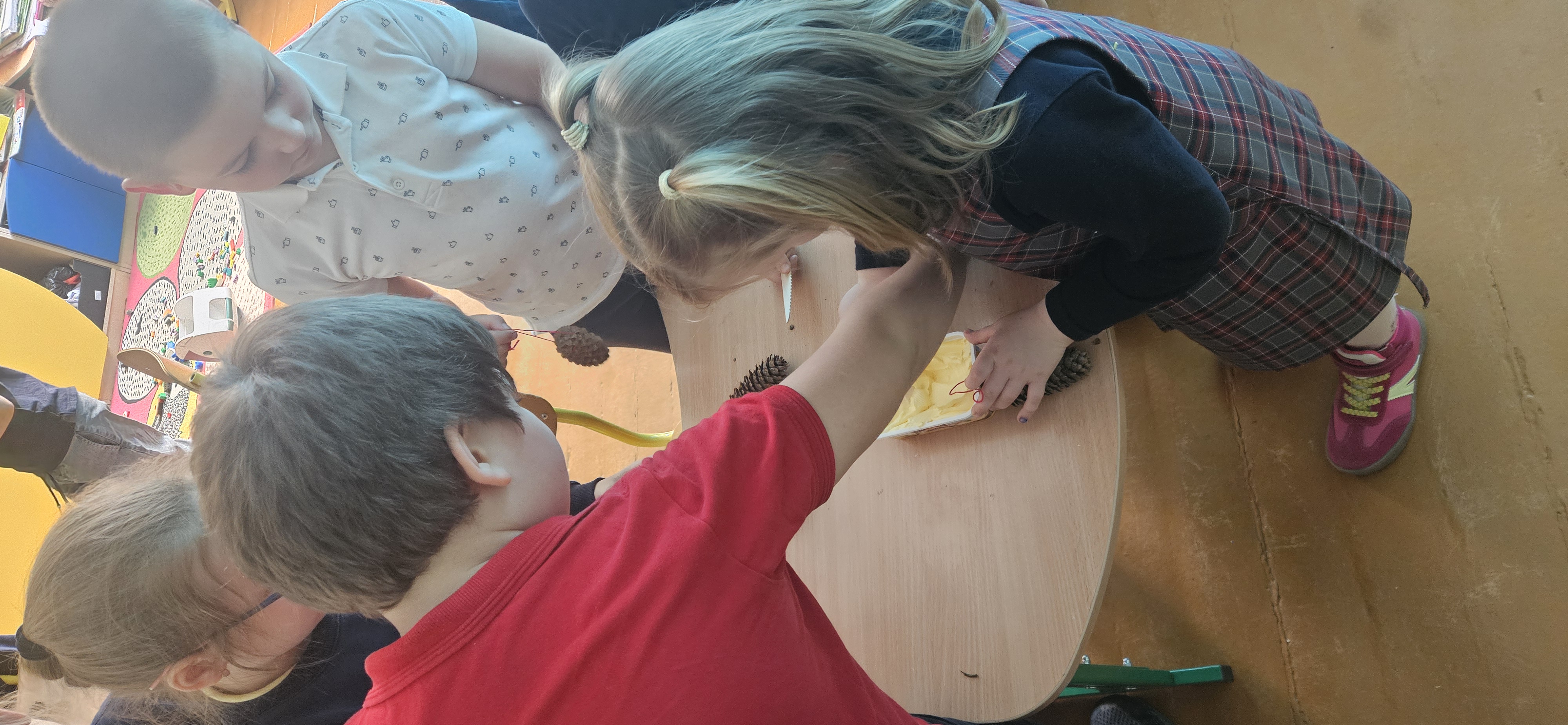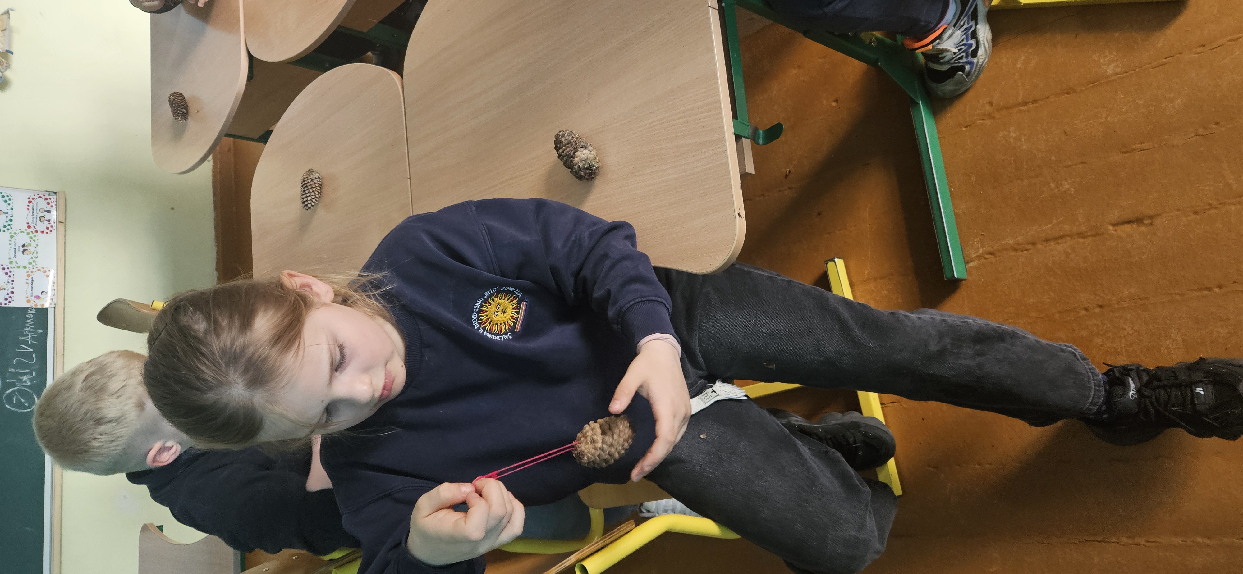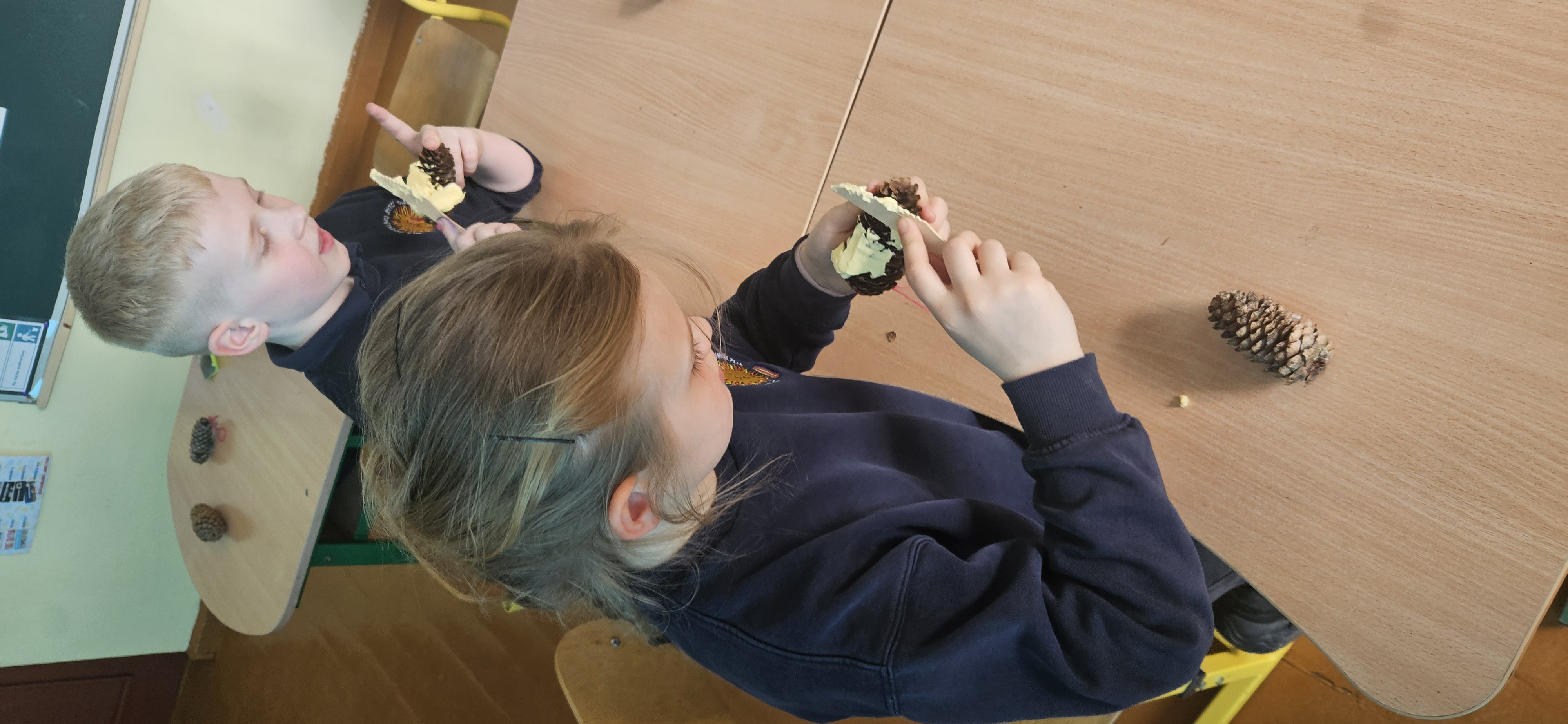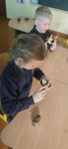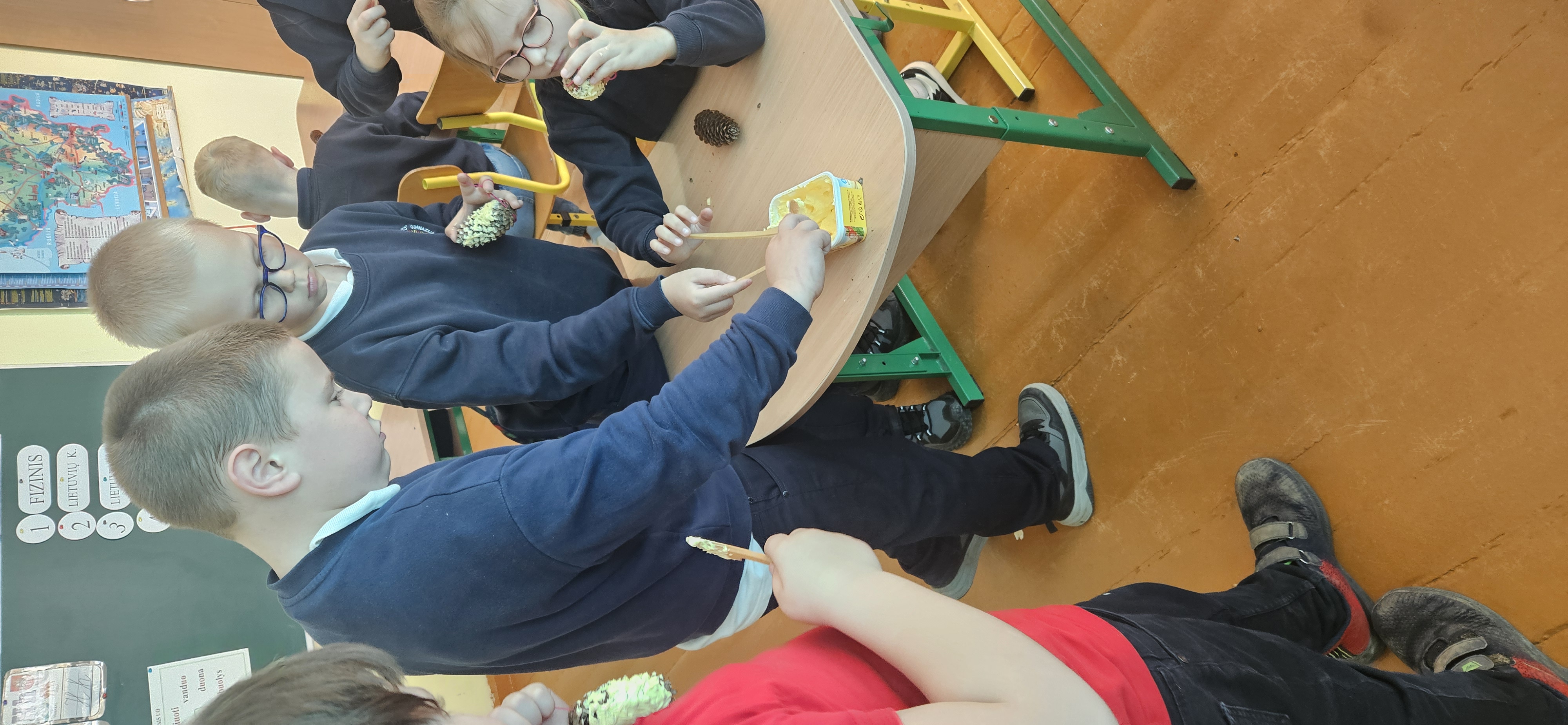 Pirmos ir antros klasės mokiniai per gamtos mokslų ir technologijų pamokas tyrinėjo eglės ir pušies kankorėžius. Veiklos metu mokiniai ieškojo jų panašumų ir skirtumų, stebėjo kankorėžių spalvą, kvapą, dydį, analizavo, ar jie turi sėklų. Tyrinėdami mokiniai lavino savo pažinimo, stebėjimo ir lyginimo gebėjimus. Po tyrinėjimo veiklos mokiniai leidosi į mokyklos kiemą ieškoti kankorėžių. Kiekvienas išsirinko jam labiausiai patikusį, kurį panaudojo kūrybinei užduočiai. Mokiniai kankorėžius ištepė sviestu, apvoliojo lesaluose ir pagamino lesyklėles paukšteliams. Pagamintas lesyklėles jie pakabino ant medžių šakų mokyklos kieme, kad atskridę paukščiai galėtų pasimaitinti.