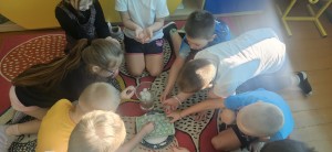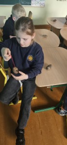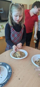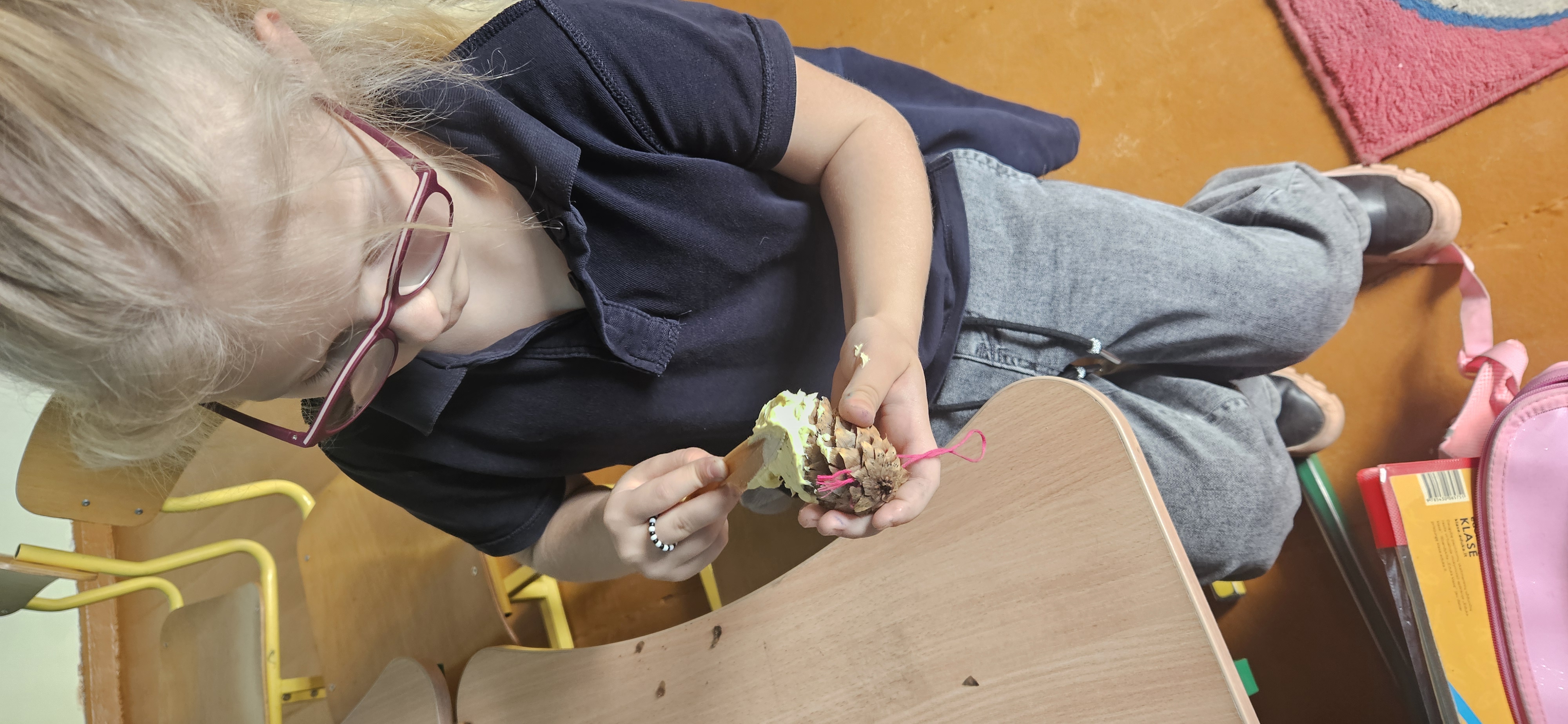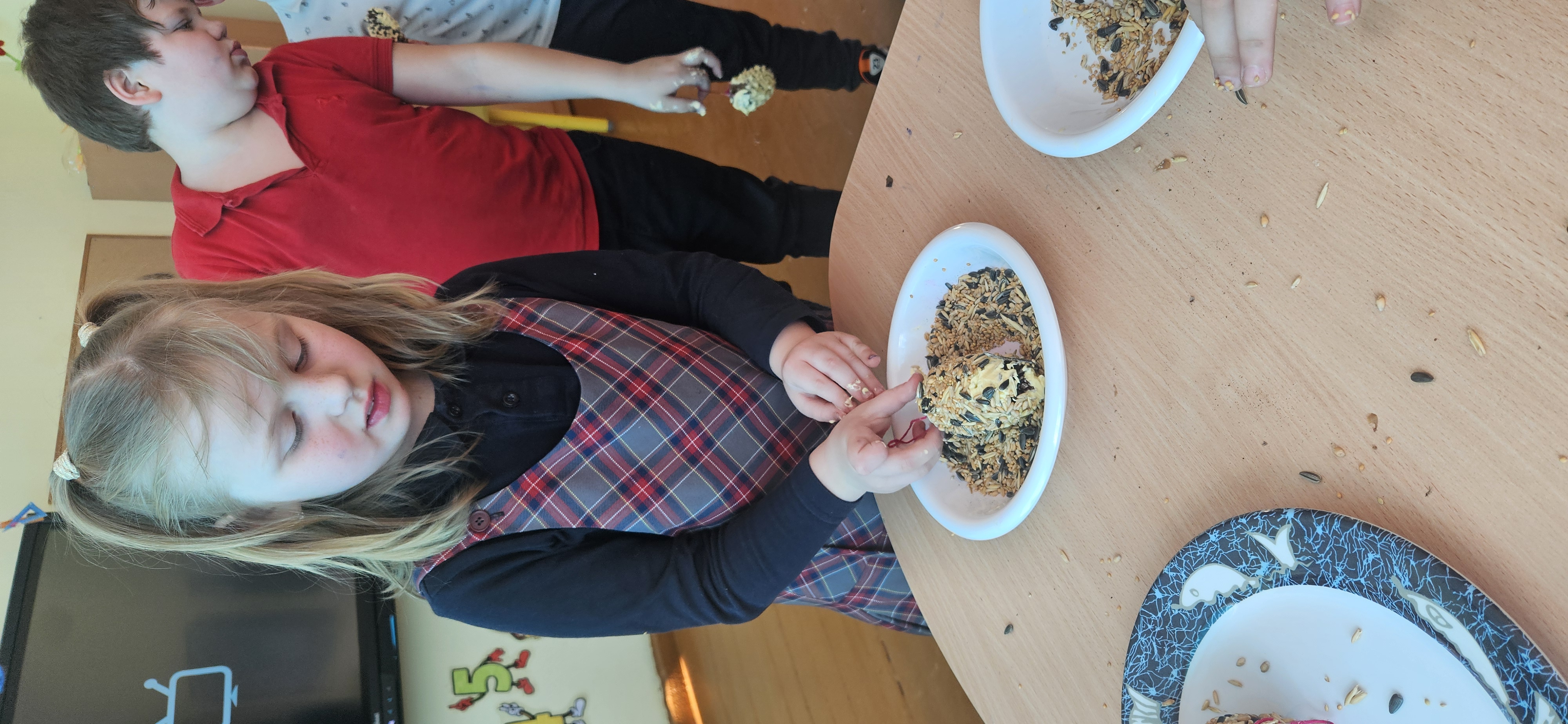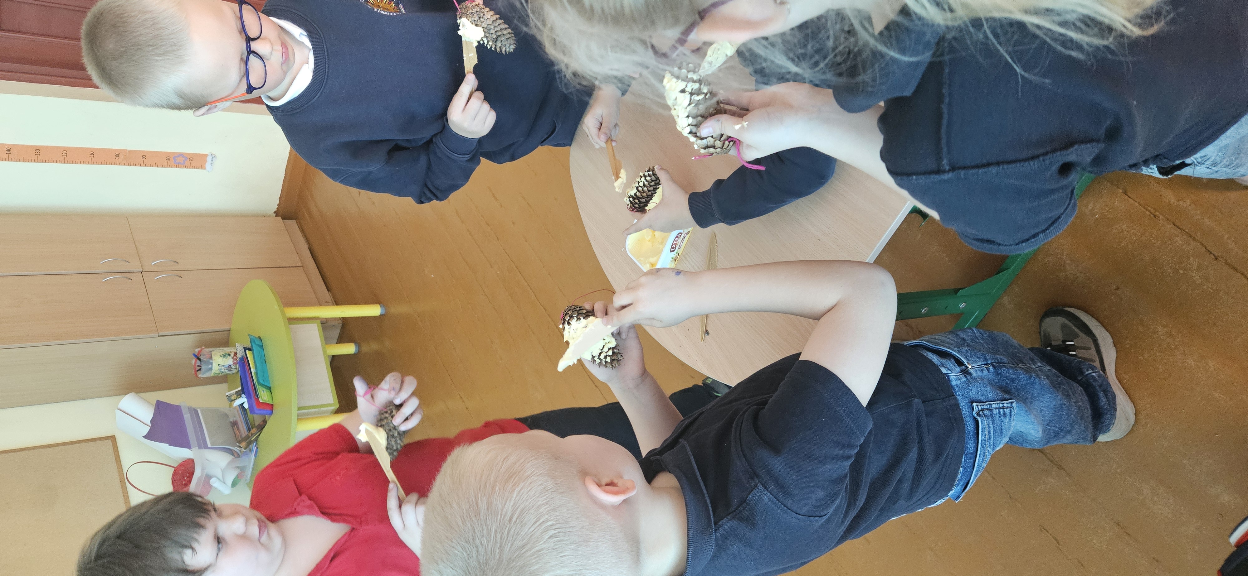 Pirmos ir antros klasės mokiniai per gamtos mokslų ir technologijų pamokas tyrinėjo eglės ir pušies kankorėžius. Veiklos metu mokiniai ieškojo jų panašumų ir skirtumų, stebėjo kankorėžių spalvą, kvapą, dydį, analizavo, ar jie turi sėklų. Tyrinėdami mokiniai lavino savo pažinimo, stebėjimo ir lyginimo gebėjimus. Po tyrinėjimo veiklos mokiniai leidosi į mokyklos kiemą ieškoti kankorėžių. Kiekvienas išsirinko jam labiausiai patikusį, kurį panaudojo kūrybinei užduočiai. Mokiniai kankorėžius ištepė sviestu, apvoliojo lesaluose ir pagamino lesyklėles paukšteliams. Pagamintas lesyklėles jie pakabino ant medžių šakų mokyklos kieme, kad atskridę paukščiai galėtų pasimaitinti.